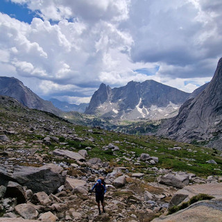 Once over and down the pass we get ready for the last pass of this Alternate, Texas pass. A very steep but rather short climb, 1'269 feet in 1 mile = 1'363.7 ft/mi (387m in 1.6km ). I am glad now that the sun is not out, I am already hot without sun! However, climbing up the pass the sky is getting covered with dark grey clouds. Only 0.2 miles before reaching the pass it starts to rain a little and we can hear thunder, but not see any lightening yet. I look around and find a big boulder, a little overhanging, not far from us. I don't feel we should cross the pass and ask Vista to wait out 5 minutes. She is fine with it and just as we reach the boulder it starts to hail on us. They hurt a lot! Both of us squeeze tightly to the boulder, holding my sitting pad above our heads to not get hurt by the hail. Luckily we put on our rain jacket already, but sadly not the rainpants yet. At first it is an adventure, we can hardly believe it and thought it will be gone within the next couple of minutes. But instead it becomes worse and worse. We are in the eye of the storm, hail, thunder and lightening right above us. I shiver badly, having hail all over my bare legs. But there isn't much we can do. They hurt a lot once the sitting pad is not covering your head. The ground is soon covered with white hail and the little streams are growing, till they run over and new streams are being created. Finally, I have no clue how much time passed, the hail stopped. I am super cold and a little worried about hypothermia. I put on my rain pants too and am barley able to get my cooker out and make a hot chocolate with coffee. But I feel it is very important to have a hot drink to warm you up from the inside and to hold the hot cup in your hands, to warm up our fingers. I share it with Vista, who is also super cold. But the clouds haven't really moved yet and we are bareley able to finish the hot chocolate, as the hail and also thunder with lightening right above us starts again. Really? Again we crawl as close to the rock as we can, hold the sitting pad above our heads and I also get the tyvek out to cover our bodies. Later we hear the whole spectacle took about 2 hours! It was long and did feel very long too! Once the lightening was over, only thunder and rain left, we decided to take the risk and climb the pass. It is either that or return down the valley and stay there for the day. Everything is covered in hail and water is coming down in little stream everywhere. Out shoes are wet within a second, my feet very cold. How can the weather change from very hot to that cold so fast? I wish the Great Divide Basin back, where it was hot and dry! We climb over the pass and traverse a snow field before we start to descend. The descent is even steeper, now that all is hail covered we can't see any trail and it consists of rocks only. I go ahead and Vista follows me. She is from Missouri and not really used to snow, so it takes us a while to get down to the bottom of the pass. But better slow and safe. Also down here everything is covered in hail and the trail is, if there is a trail!, often flooded badly. It has stopped raining though once we passed the Pass. And when the sun came back half an hour later, we took a break to take off and dry our raingear and tyvek. But I just manage to get my pants off, as it starts to rain again, even though the sun is still out. The rain picks up and the sun eventually is not there anymore. Well, that didn't work out very well. Even though it only rains a couple of minutes, the sun never came back that day. But the 5 minutes the sun was out were great. I warmed up again, just to get cold later again... our goal of today is now to reach the reconnection with the official CDT and to leave the Cirque of the Towers alternate behind us. By 7 pm, feeling exhausted, tired, cold and hungry, we reach that point finally. We didn't dry out our gear today, so we have to pitch our wet tents and hope they dry out a little while we cook dinner. Well, our 25 miles daily goal shrinked down to 15 miles today. And we think that the K2's are far behind us and never made it over the pass today. We still have 60 miles (96 km) and about 10'000 feet (3'050 m) in elevation to climb left before reaching green lakes, from where we hope to get a hitch into Pinedale. We hoped to hike 25 miles minimum daily, to be there by saturday. That's definitely not gonna happen anymore.
