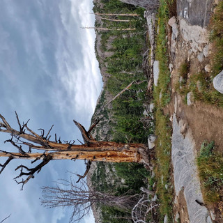 All the climbing of today is mostly in the afternoon. Vista hikes out a couple of minutes before me, but little later I pass her again. We have discussed camp spots for tonight, but I will await her again in the afternoon for sure. Just before reaching the bottom of Hat Pass, it started to rain heavily on me. I am looking for a tree to hide under, as it also starts to hail a little. I waited out the storm under that tree, it only lasts a couple of minutes and the sun is back out. But since I dried out my gear in the morning we are being hunted by rain. All afternoon we get rained on a little, but manage to escape the big rain, so I never put on my raingear yet. When I see Vista I start the climb up to Hat Pass. But only about half a mile in, I had to stop under a tree again, due to rain and little hail. Vista is just behind me and together we wait about 10 minutes. Then we move on, like another 0.3 miles before the next rain and hail is hitting us and we hid under the next tree! Luckily theses storms only last a couple of minutes so it is easy and best to wait them out. 1.5 miles later, only 0.4 miles before the top of the pass, it starts to thunder, lightening and rain heavily. I have some good trees next to me and hide under them, thinking this will also only last for 5 or 10 minutes. Another hiker from LA, being out here for 1 week, is joining me. He was on his way up to the top of the pass, but then turned around when the lightening started. Quickly I realized that this is gonna be a heavier storm, also it starts to hail again, and these hail corns are bigger. I put on my rainjacket and rainpants (I have learned my lesson yesterday!) And hide deeper into the trees. Vista must be under some trees behind me too. I am happy the guy from LA is here with me! I get very cold, it's also heavily windy, even with my raingear on, and I put on my jumper and gloves too. Under these trees it is a little easier to do, but I still get a little wet. I thought we waited for about 30 minutes but the storm took actually slightly more than an hour again, messing up with our hiking schedule! Having the trees as shelter and not only the rock as yesterday was much more comfortable though. I still don't want to repeat this again! As soon as the storm passed and there is a break from hail, Vista hikes by and together we run up to the top of the pass, both being scared that may a second storm will roll over any minute, as it did yesterday. Reaching the top we get blue sky on the other side. And the sun is just about to come out again, wonderful! I could use some sun and warmth and drying off my rain gear while hiking. The views are stunning and very dramatic with that weatfer. We are hiking on but soon realize that we will not make it to our camp site in about 3.6 miles anymore. It is already 7.30pm. We decide to grab water at the next source and look around for a camp site thereafter, as we run into a hiker going south. He tells us about great camping coming up in abouts1.3 miles. Let's do it! We get water at the next river in 0.3 miles and hike up the next hill to a junction 0.3 miles further. There is a great flat area with trees and about 10 other camper's (so it was only 0.6 miles and not 1.3 miles as the other hiker thought). We find a great spot, save from the heavy winds, a little away from all the others, cook dinner right in front of Vista's tent and are finally in tent by 9.15pm, just as it starts to rain, thunder and lightening again! Good timing! And we only did about 2 miles less than we planned for, again the hailstorm in the afternoon crossed our plans. But that's fine. Tomorrow we will try to hike 25+ miles and the day after we hopefully we make it to Pinedale! I am so ready for a bed, a hot shower, warm food and a good rest!