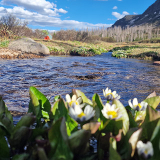 The day started as it ended yesterday. With some small but brutal steep uphill climbs. And the we reached the ridge line. Absolutely stunning and I did not expect it at all. I looooved this stretch. One of my favorite one's so far. After lunch we climbed a knees edge. There were still some snow sections to traverse and it when down brutal steep to the valley. Alternatively you could climb down to the valley and hike back up to the trail but the snow traverses looked doable to us. We carry ice axes and we should use them for sure once while hiking! So we decided to hike the trail. The first snow traverse was the sketchiest one. But it definitely looked better from the start then when we hiked it. Also, it was in the afternoon and the snow was already slushy. Kiernan hiked ahead, making good footprints for us in the snow traverses. Still, we used the ice axes. And it took as a long time to hike this stretch, but we made it safely, which is more important. The last 5 miles included two uphill hikes and a long, narrow and stony downhill hike to a beautiful meadow. Again, as normal after lunch, dark clouds popped up, and we even could feel some raindrops of a cloud far away, but the heavy winds brought the raindrops to us. Nothing bad, I didn't even put on my rain pants. Down the meadow the sun was out again in the late afternoon, perfect for us to enjoy dinner next to a beautiful little stream. Patches sadly still didn't catch up with us.