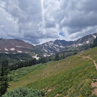 We resupply at the local market and while sitting outside getting our gear ready and just about calling an UBER, a young sporty lady walks by, asking us if we need a ride. She has recognized us as CDT hikers, herself hiked the PCT a couple of years ago and hence knows hiker life. That's super awesome! So we got in the car and started hiking back at the trail head from Grey's Peak shortly after 11am. The first three miles lead us along a nice bicycle trail in the forest, however all street for race bikes. We are at low elevation and it is very hot. And who do we find there laying in the shade of some trees? Young Jules, I have last seen at the Butterfly House on Monarch Pass! How is this possible? I thought he would be far ahead, as we took a couple of zeros in Salida and he hiked out the next day. He got sick and had to stay 3 days in Breckenridge to recover. That explains it all! It's nice to see him though! We hike on together, cross the I-70 and follow a nice trail upda valley. The trail is filled with day hikers. And every second person at least has a dog! And they all smell good😁 most of them are already on their way back to the car. Our trail turns to the left after a very steep uphill section, and leaves the day hikers behind. We planned on having lunch around 8 miles in at the last water source for 10 miles. It's weird to go from water everywhere to no water again. That implies bigger water carries and lunch and camp stops close to the last water. Not my favorite an I thought we are done with that in New Mexico!