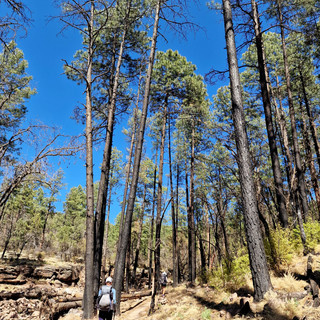The trail leaves the dirt road, crosses a river with a little flowing water (first flowing water source on trail, so excited!) and goes along a very small, but dry, river bed. Apparently it has been very dry so far this year with much less rain than normally. So a lot of streams which normally carry water are dry now. But this one is not completely dry yet. It's like a secret tiny valley here with green grass! I love it. Soon later the trail starts to gain in elevation and we get rewarded with beautiful views. We climb up over 2'000 meters above sea level. Dogbite and I climb a rock. Well, more like he pushed me up there and then climbed up too🤣 to get down was harder though!🤣 This has been my favorite day on trail so far. The views are stunning and I absolutely love it here. The rock formations are amazing and there are pine trees!