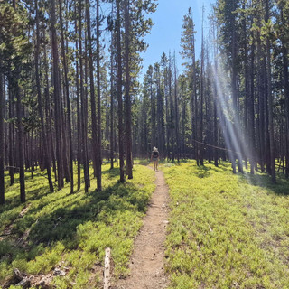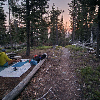 We hike out late afternoon again and stop for dinner 3 miles in. There is an empty trailer next to the trail and we hop on it for dinner, great place!😁 we hike out a couple of more miles, till it is dark and we find a perfect camp spot, already prepared by previous hikers, surrounded by trees (some of them death and fallen, others still looking strong). It is a beautiful evening, very warm, dry and no wind. Hence we decide to use this great wheather window again for cowboy camping. But as soon as we are in our sleeping bags, the wind picks up dramatically. The trees are shacking and making weird noises around. We may also get some rain if we are unlucky. We are thinking of getting up again and pitching the tents, but both of us are too tired and lazy to do so. Also, it is not primary the possible rain which worries me, or that grizzly's have been spotted right here a day or two ago, but that a tree could fall down on us. A tent wouldn't be any protection from this danger neither. I am watching the trees around us carefully but after about 30 minutes I give up. I can't change things right now, worrying doesn't help so I better use the time to recover and sleep. I put in my earplugs, cover my eyes with my bandana and have a surprisingly wonderful deep sleep!